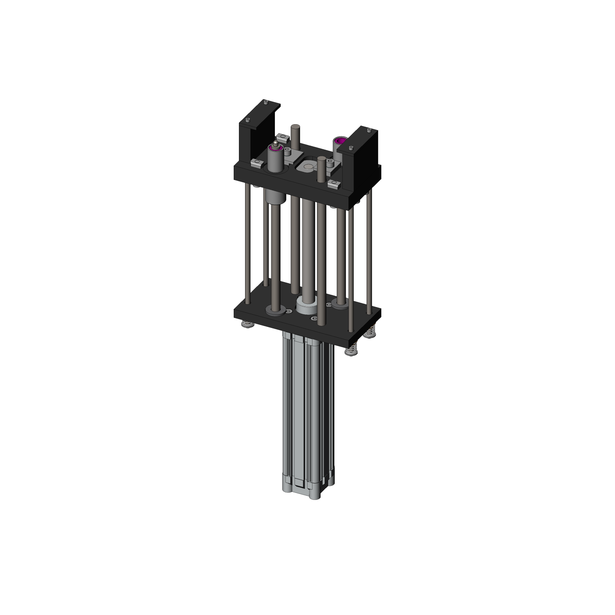 Der auf der Transportkette angehaltene Werkstückträger wird mit dem Zentriermodul von der Kette angehoben und in seiner Lage zentriert (fixiert).Zwei seitliche Niederhaltewinkel garantieren eine saubere Indexierung und stabile Lage der Werkstückträger im zentrierten Zustand.